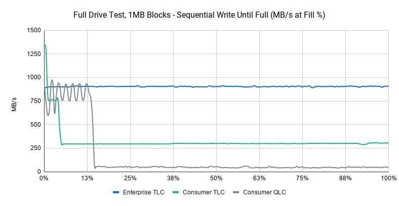 为了获得驱动器的稳态性能,我们进行了完整的填充测试。该测试还可以指出在使用NAS作为SSD缓存的繁忙NAS上的驱动器工作负载,因为它们将不断填充最近访问的数据。由于没有足够的时间进行恢复,这个测试将耗尽驱动器上所有SLC缓存机制。