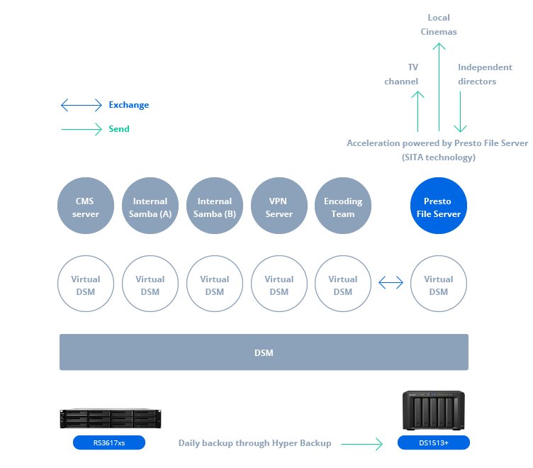 BlueSky现在可以在一个服务器上同时向很多合作伙伴分发内容。因为在SynologyNAS上启用了Btrfs文件系统,所以BlueSky只需要同一文件的一个实体拷贝,这样就可以保留更多容量以存储更多内容。