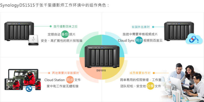 一次偶然机会,张千里摄影师参加了Synology的DSM操作系统发布会,通过现场工作人员的讲解,张千里了解到SynologyNAS服务器有相当高的可靠性,同时操作又直观又容易上手,对IT技术产品不太熟悉的摄影师群体也可以轻松上手,2012年开始张千里决定尝试DS1513+,以备备不时之需,并在2015年额外购买了DS1515作为工作室的NAS服务器。